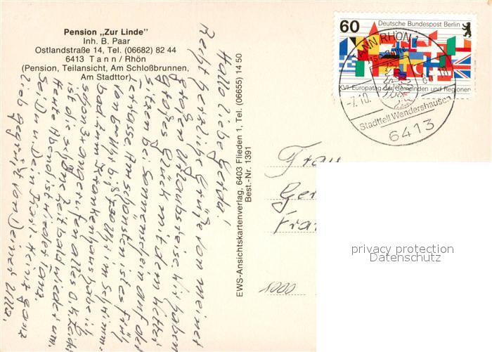 73712413 alte Postkarte Tann Rhoen Pension Zur Linde Panorama Pferdekutschfahrt Schlossbrunnen Stadttor postalisch gelaufen Erhaltung siehe scans [WerneD78] KatCode: 11110006631023