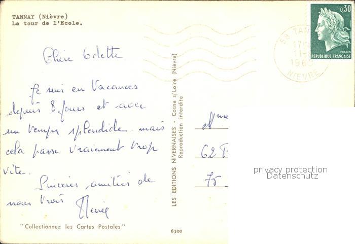 12002175 carte postale Tannay Nievre La Tour de L Ecole postalisch gelaufen Erhaltung siehe scans KatCode: 11170058258286