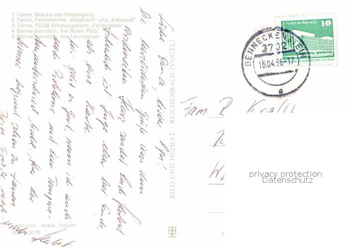 72629462 alte Postkarte Tanne Harz Bruecke Ortseingang Ferienheime Waldheim und Edelweiss FDGB Erholungsheim Ferienglueck Benneckenstein Am Roten Platz Am Teichdamm postalisch gelaufen Erhaltung siehe scans [WerneD78] KatCode: 11110015085325