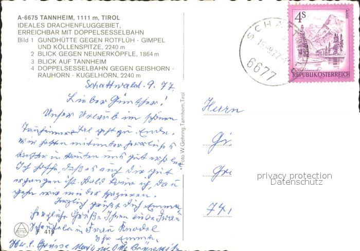72207612 alte Postkarte Tannheim Tirol Gundhuette Rotfluh Neunerkoepfle Tannheim Doppelsesselbadhn Drachenflieger postalisch gelaufen Erhaltung siehe scans KatCode: 11390331070832