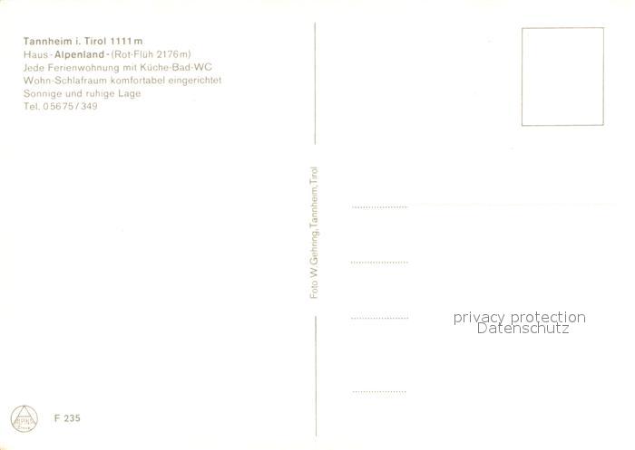 73642863 Tannheim Tirol Haus Alpenland Ferienwohnungen Alpele Vilsalpsee Alpen postalisch nicht gelaufen Erhaltung siehe scans [FriedD77] KatCode: 11390331070832