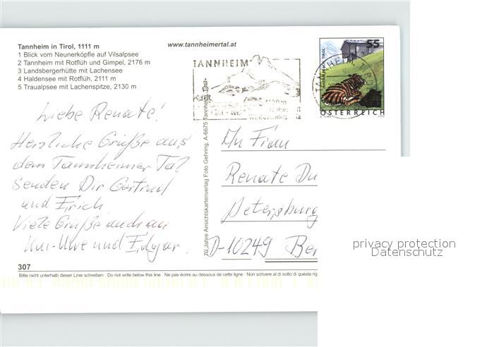 72480341 alte Postkarte Tannheim Tirol Vilsalpsee Rotflueh Gimpel Lachenspitze postalisch gelaufen Erhaltung siehe scans KatCode: 11390331070832