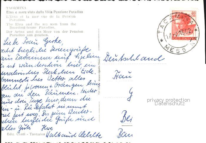 old postcard Taormina Sizilien Etna Villa Pensione Paradiso postalisch gelaufen Erhaltung siehe scans