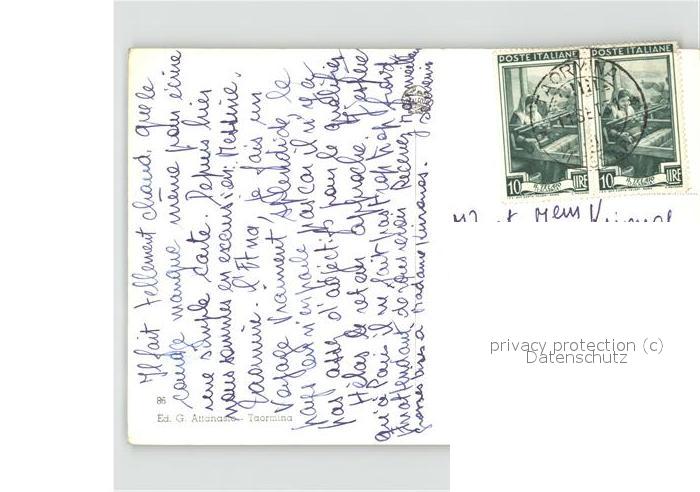 old postcard Taormina Sizilien Etna vista dall‘ Albergo Paradiso Vulkan postalisch gelaufen Erhaltung siehe scans
