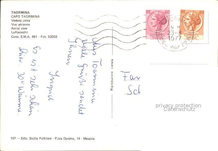 old postcard Taormina Sizilien Fliegeraufnahme postalisch gelaufen Erhaltung siehe scans