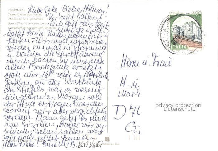 old postcard Taormina Sizilien Griechisches Theater postalisch gelaufen Erhaltung siehe scans