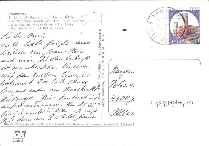 old postcard Taormina Sizilien Mazzaro Strand Bella Insel postalisch gelaufen Erhaltung siehe scans