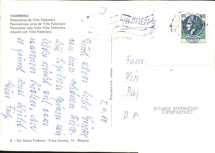 old postcard Taormina Sizilien Panoramica da Villa Falconara postalisch gelaufen Erhaltung siehe scans