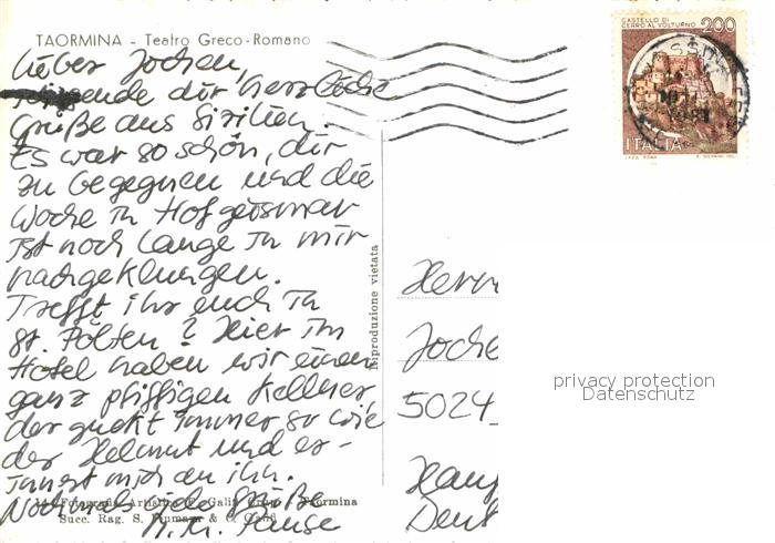 old postcard Taormina Sizilien Teatro Greco Romano postalisch gelaufen Erhaltung siehe scans [WerneD78]