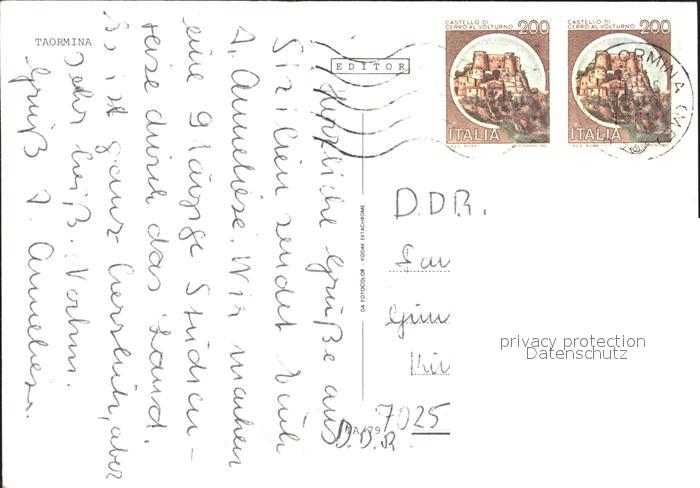 old postcard Taormina Sizilien Teilansichten Kueste Strand Ruine Trachten postalisch gelaufen Erhaltung siehe scans