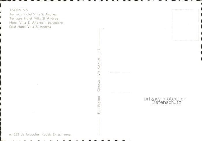 Taormina Sizilien Terrazza Hotel Villa Sant Andrea Spiaggia postalisch nicht gelaufen Erhaltung siehe scans