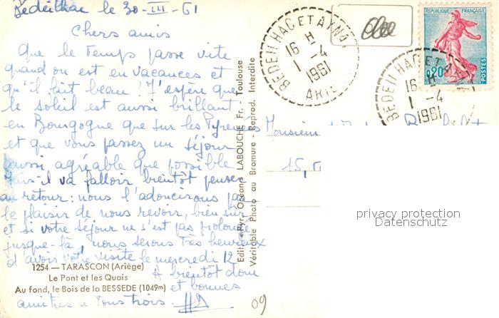 13490056 carte postale Tarascon-sur-Ariege Le Pontet les Quais Au fond le Bois de la Bessede postalisch gelaufen Erhaltung siehe scans [WerneD78] KatCode: 11170009109306
