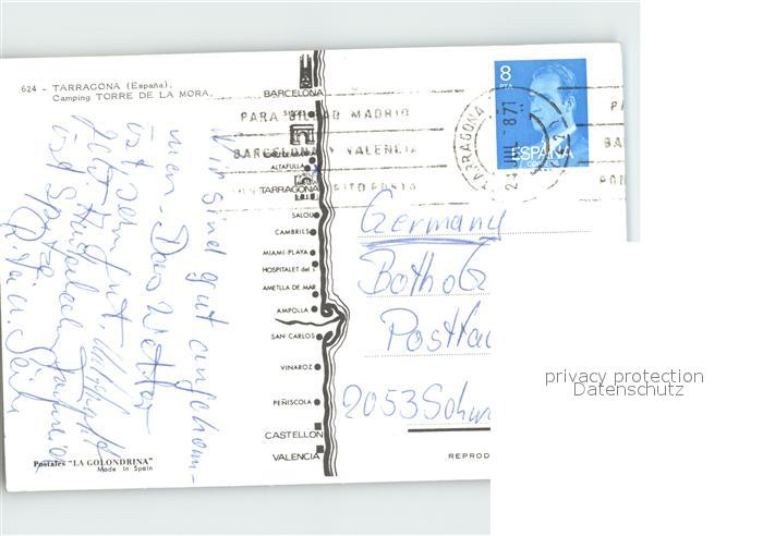 old postcard Tarragona Camping Torre de la Mora postalisch gelaufen Erhaltung siehe scans