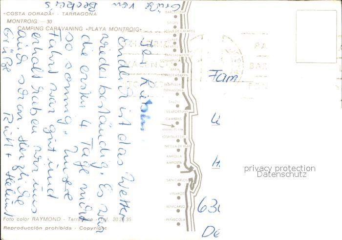 old postcard Tarragona Costa Dorada Camping Caravaning Playa Montroig postalisch gelaufen Erhaltung siehe scans