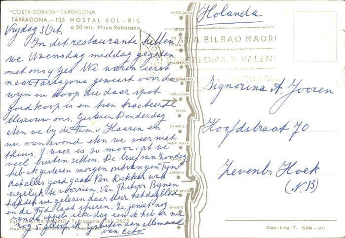 old postcard Tarragona Hostal Sol Ric Restaurante Playa Paseo Uferpromenade postalisch gelaufen Erhaltung siehe scans