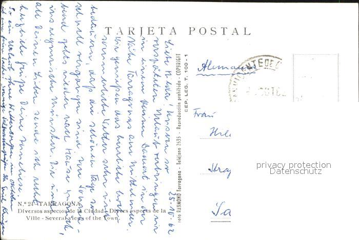 old postcard Tarragona Strand Promenade Triumpfbogen postalisch gelaufen Erhaltung siehe scans