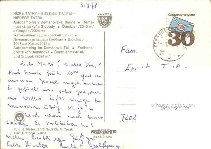 old postcard Tatra Vysoke Gebirge Camping Jasna Niedere Tatra postalisch gelaufen Erhaltung siehe scans