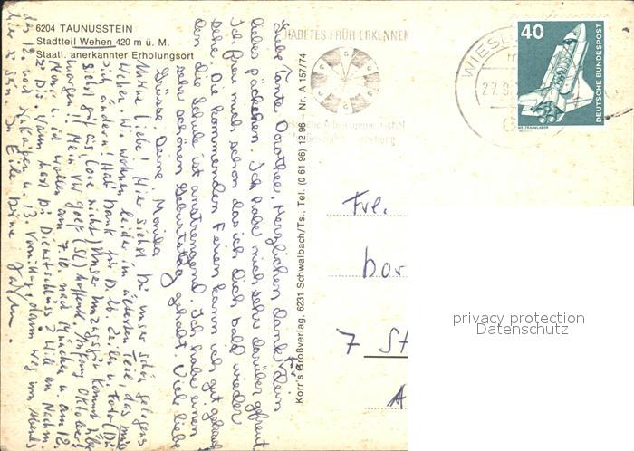 72922684 alte Postkarte Taunusstein Fliegeraufnahme Wehen postalisch gelaufen Erhaltung siehe scans [LiesaD40] KatCode: 11110006439015
