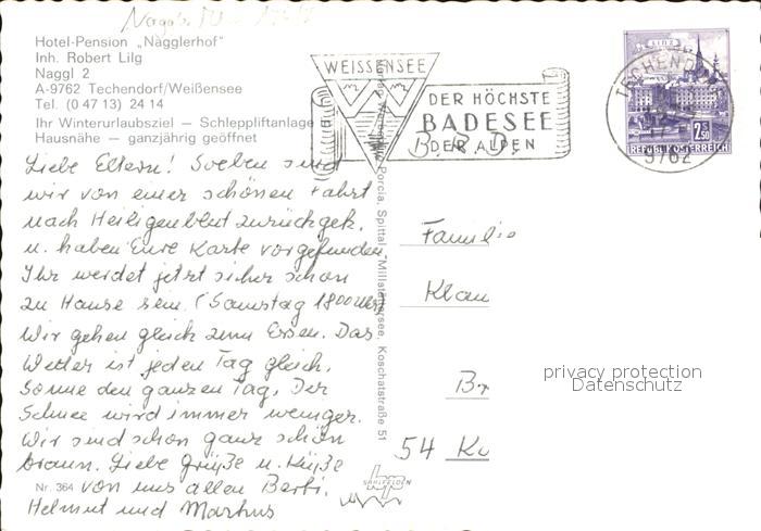 72494518 alte Postkarte Techendorf Weissensee Hotel Pension Nagglerhof postalisch gelaufen Erhaltung siehe scans KatCode: 11390