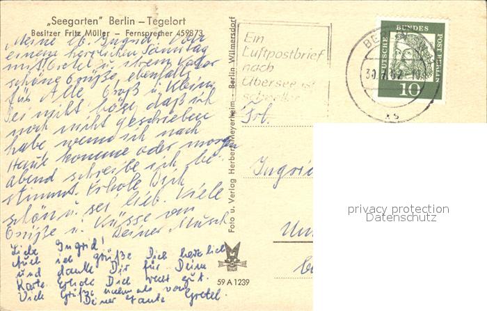 alte Postkarte Tegelort Seegarten Ausflugsschiffe Terrasse Speisesaal postalisch gelaufen Erhaltung siehe scans