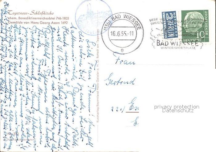 72377269 alte Postkarte Tegernsee Bayern Schlosskirche ehem. Benediktinerabtei Gemaelde von HG Asam postalisch gelaufen Erhaltung siehe scans KatCode: 11110009182132