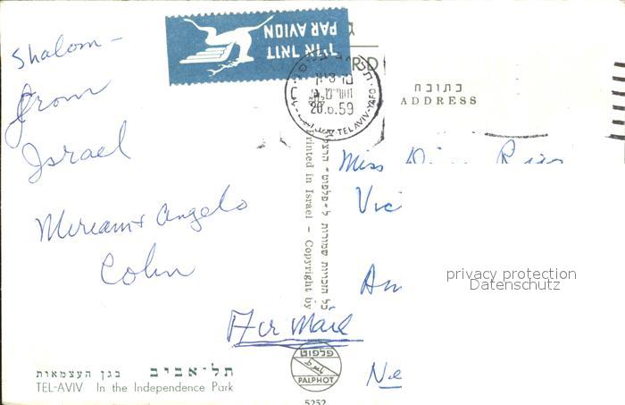 old postcard Tel Aviv Independence Park postalisch gelaufen Erhaltung siehe scans