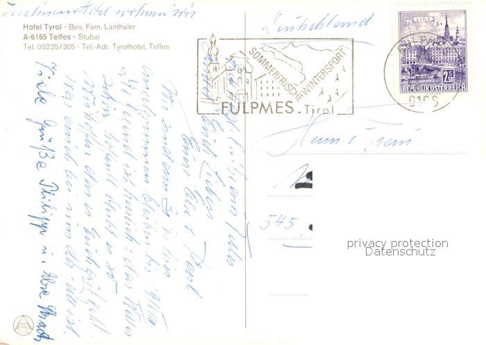 73515176 alte Postkarte Telfes Stubai Hotel Tyrol Gastraeume Kaminzimmer postalisch gelaufen Erhaltung siehe scans [WerneD78] KatCode: 11390332070356