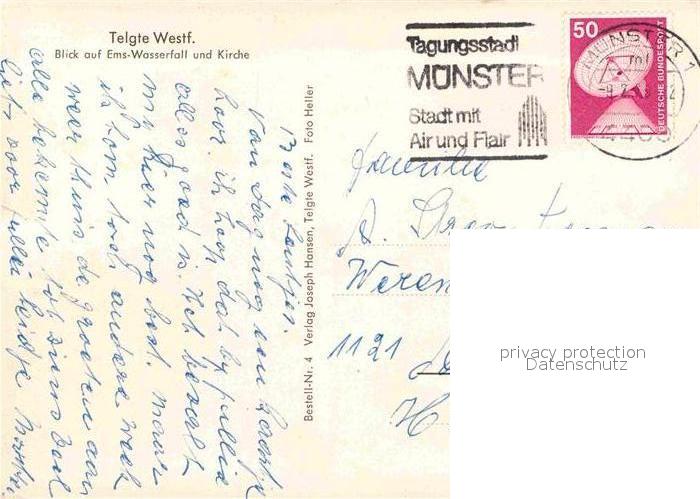 72855931 alte Postkarte Telgte Warendorf Blick auf Ems Wasserfall und Kirche postalisch gelaufen Erhaltung siehe scans [FriedD77] KatCode: 11110005570044