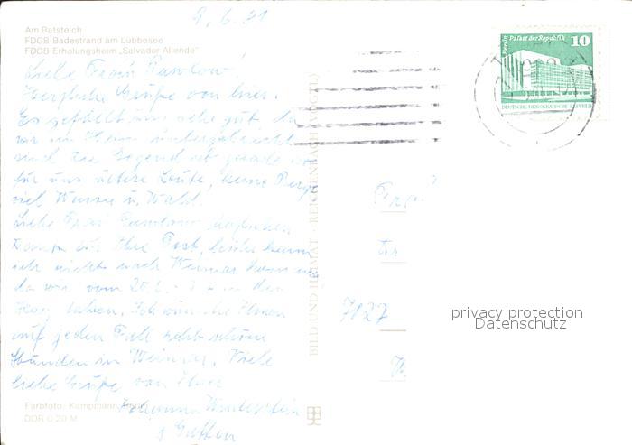 72114506 alte Postkarte Templin Am Ratsteich Badestrand am Luebbesee FDGB Heim Salvador Allende postalisch gelaufen Erhaltung siehe scans KatCode: 11110012073572