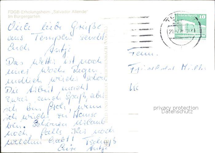 72382930 alte Postkarte Templin Erholungsheim Salvador Alllende im Buergergarten postalisch gelaufen Erhaltung siehe scans KatCode: 11110012073572