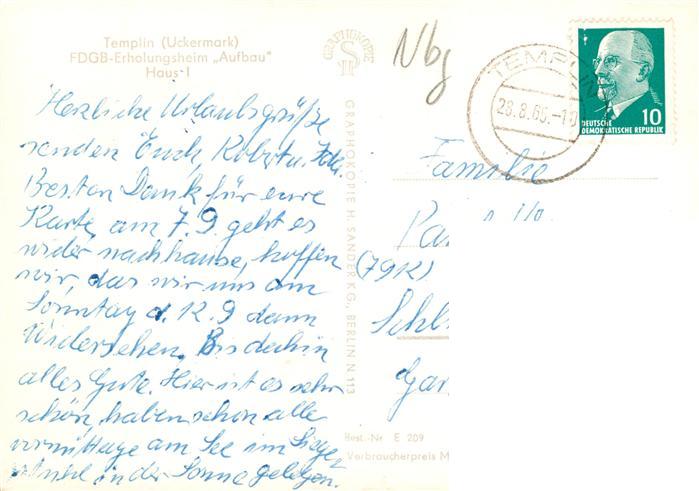 73923776 alte Postkarte Templin FDGB Erholungsheim Aufbau Haus I postalisch gelaufen Erhaltung siehe scans [WerneD78] KatCode: 11110012073572