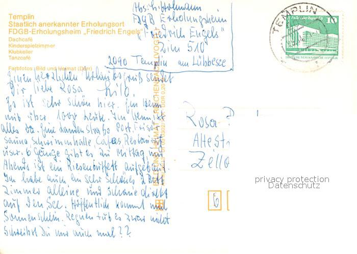 73544815 alte Postkarte Templin FDGB Erholungsheim Friedrich Engels Cafe Kinderspielzimmer Klubkeller Tanzcafe postalisch gelaufen Erhaltung siehe scans [FriedD77] KatCode: 11110012073572