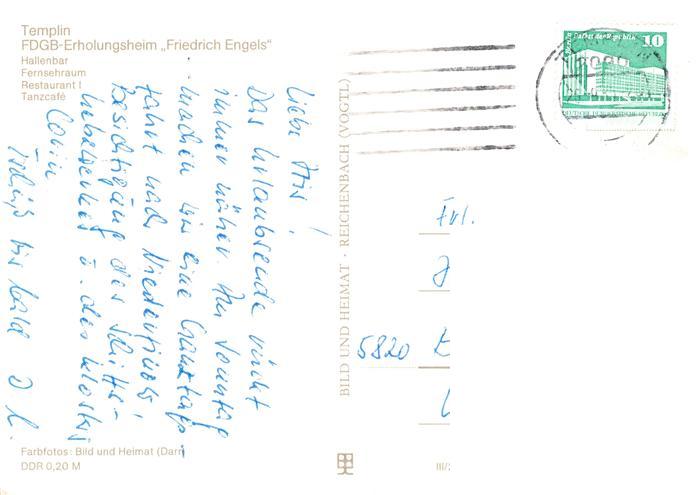 73882674 alte Postkarte Templin FDGB Erholungsheim Friedrich Engels Hallenbar Fernsehraum Restaurant Tanzcafe postalisch gelaufen Erhaltung siehe scans [WerneD78] KatCode: 11110012073572