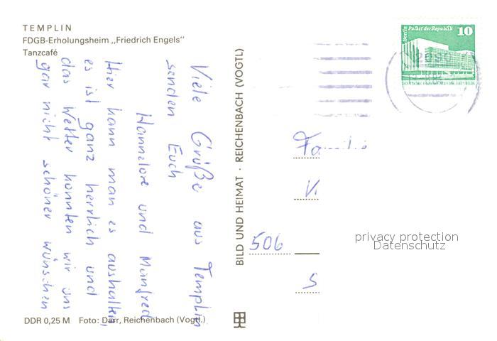 73095068 alte Postkarte Templin FDGB Erholungsheim Friedrich Engels Tanzcafe postalisch gelaufen Erhaltung siehe scans [KathaD81] KatCode: 11110012073572