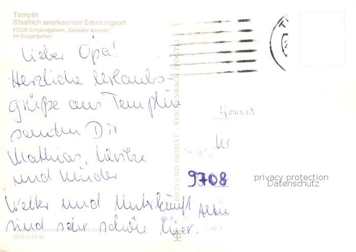 73867216 alte Postkarte Templin FDGB Erholungsheim Salvador Allende Im Buergergarten postalisch gelaufen Erhaltung siehe scans [WerneD78] KatCode: 11110012073572