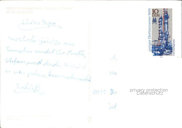 72157395 Templin FDGB Erholungsheim Salvador Allende Partie im Buergergarten postalisch nicht gelaufen Erhaltung siehe scans KatCode: 11110012073572