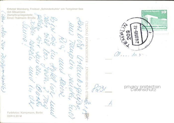 72411483 alte Postkarte Templin Freibad Schinderkuhle am Templiner See Gleuensee Dampferanlegestelle Thaelmann Str postalisch gelaufen Erhaltung siehe scans KatCode: 11110012073572