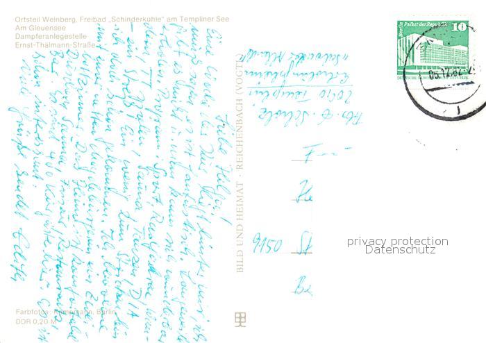 73183055 alte Postkarte Templin Gleuensee Dampferanlegestelle Ernst Thaelmann Strasse OT Weinberg Freibad am Templiner See postalisch gelaufen Erhaltung siehe scans [FriedD77] KatCode: 11110012073572