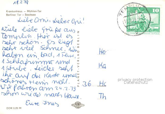 73600046 alte Postkarte Templin Krankenhaus Muehlentor Berliner Tor Stadtsee postalisch gelaufen Erhaltung siehe scans [FriedD77] KatCode: 11110012073572