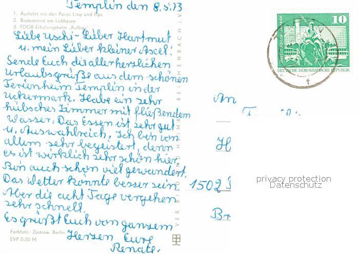 72780440 alte Postkarte Templin Ponykutsche Badestrand Luebbesee FDGB Erholungsheim Aufbau postalisch gelaufen Erhaltung siehe scans [FriedD77] KatCode: 11110012073572
