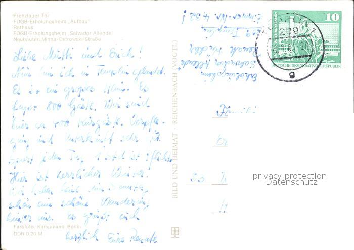 72393528 alte Postkarte Templin Prenzlauer Tor Erholungsheim Salvador Allende Rathaus postalisch gelaufen Erhaltung siehe scans KatCode: 11110012073572