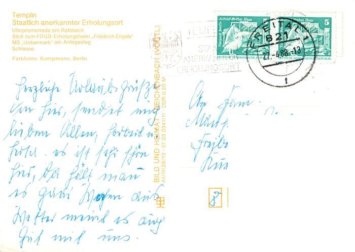 73888490 alte Postkarte Templin Uferpromenade am Ratsteich FDGB Erholungsheim Friedrich Engels MS Uckermark am Anlegesteg Schleuse postalisch gelaufen Erhaltung siehe scans [FriedD77] KatCode: 11110012073572
