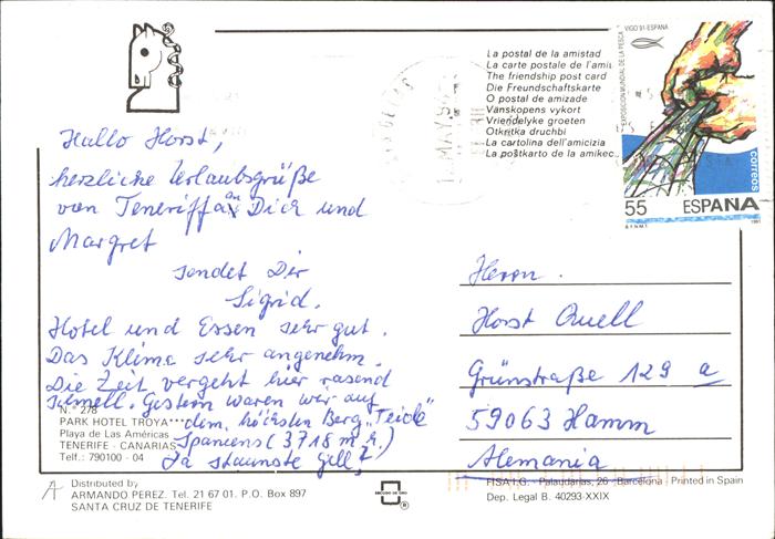 old postcard Tenerife Park Hotel Troya Swimming Pool Playa de Las Americanas Strand Windsurfung Wassersport postalisch gelaufen Erhaltung siehe scans