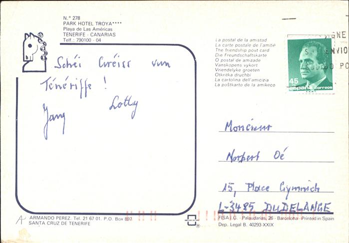 old postcard Tenerife Park Hotel Troya Swimming Pool Windsurfing Wassersport Playa de Las Americas postalisch gelaufen Erhaltung siehe scans