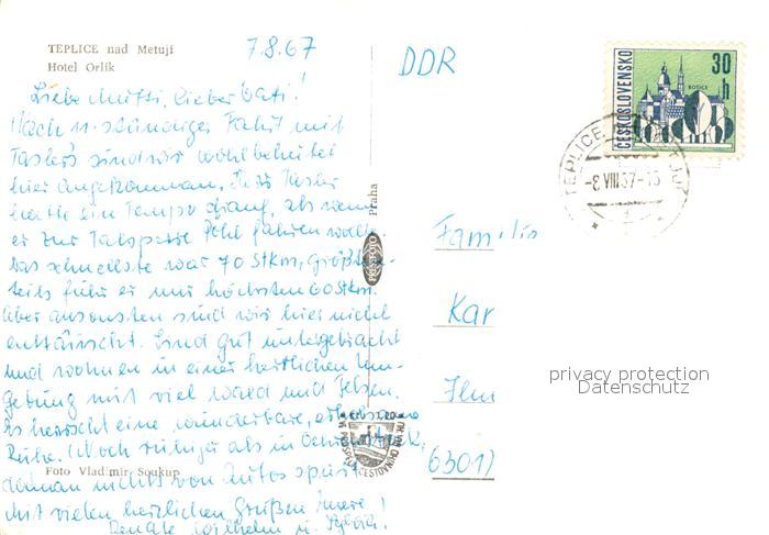 13218367 old postcard Teplice Metuji Hotel Orlik postalisch gelaufen Erhaltung siehe scans [FriedD77] KatCode: 11520