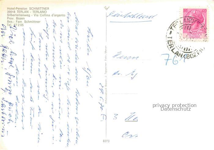 74095955 old postcard Terlan Terlano Suedtirol BOLZANO IT Hotel Pension Schmittner postalisch gelaufen Erhaltung siehe scans [WerneD78] KatCode: 11240