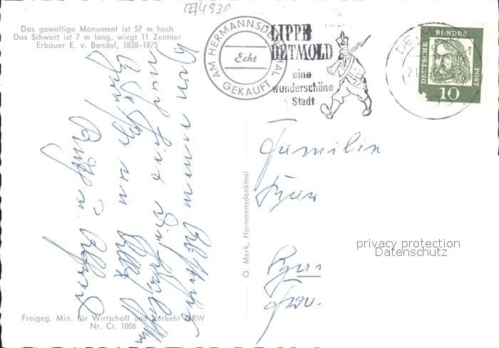 72923301 alte Postkarte Teutoburgerwald Hermannsdenkmal Fliegeraufnahme postalisch gelaufen Erhaltung siehe scans [WerneD48] KatCode: 11110005766020