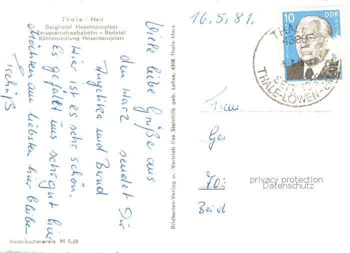 73754349 alte Postkarte Thale Harz Berghotel Hexentanzplatz Schwebebahn Bodetal Koehlersiedlung postalisch gelaufen Erhaltung siehe scans [FriedD77] KatCode: 11110015085330
