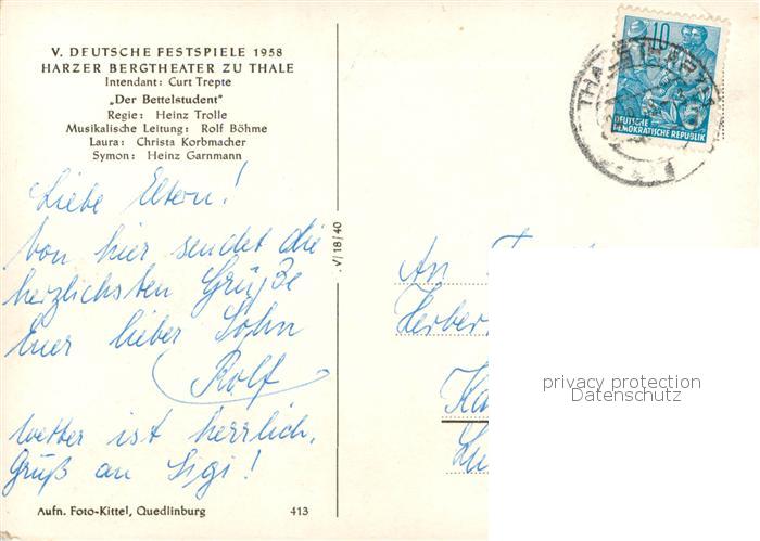 73776668 alte Postkarte Thale Harz Dt Festspiele Harzer Bergtheater Der Bettelstudent postalisch gelaufen Erhaltung siehe scans [WerneD78] KatCode: 11110015085330