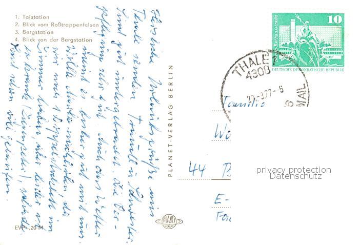 73873887 alte Postkarte Thale Harz Personenschwebebahn Talstation Blick vom Rosstrappenfelsen Bergstation Blick von der Bergstation postalisch gelaufen Erhaltung siehe scans [WerneD78] KatCode: 11110015085330